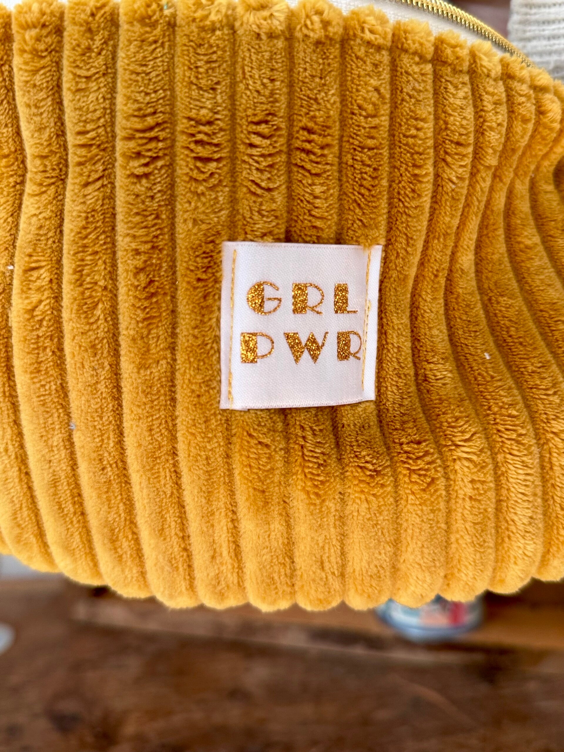 Grand sac banane fait main en velours côtelé large moutarde avec son étiquette "Girl Power"
