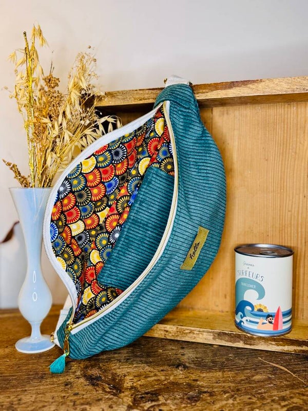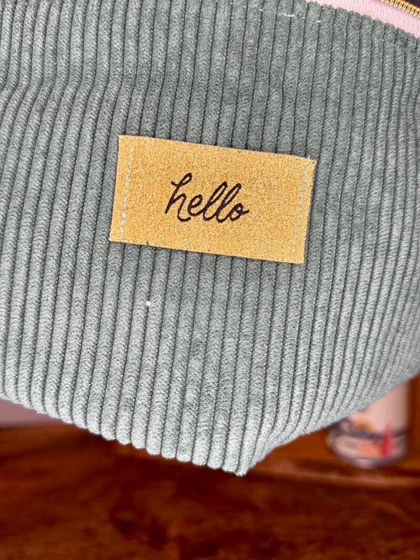 Grand sac banane fait main en velours côtelé fin vert sapin avec son étiquette "hello"