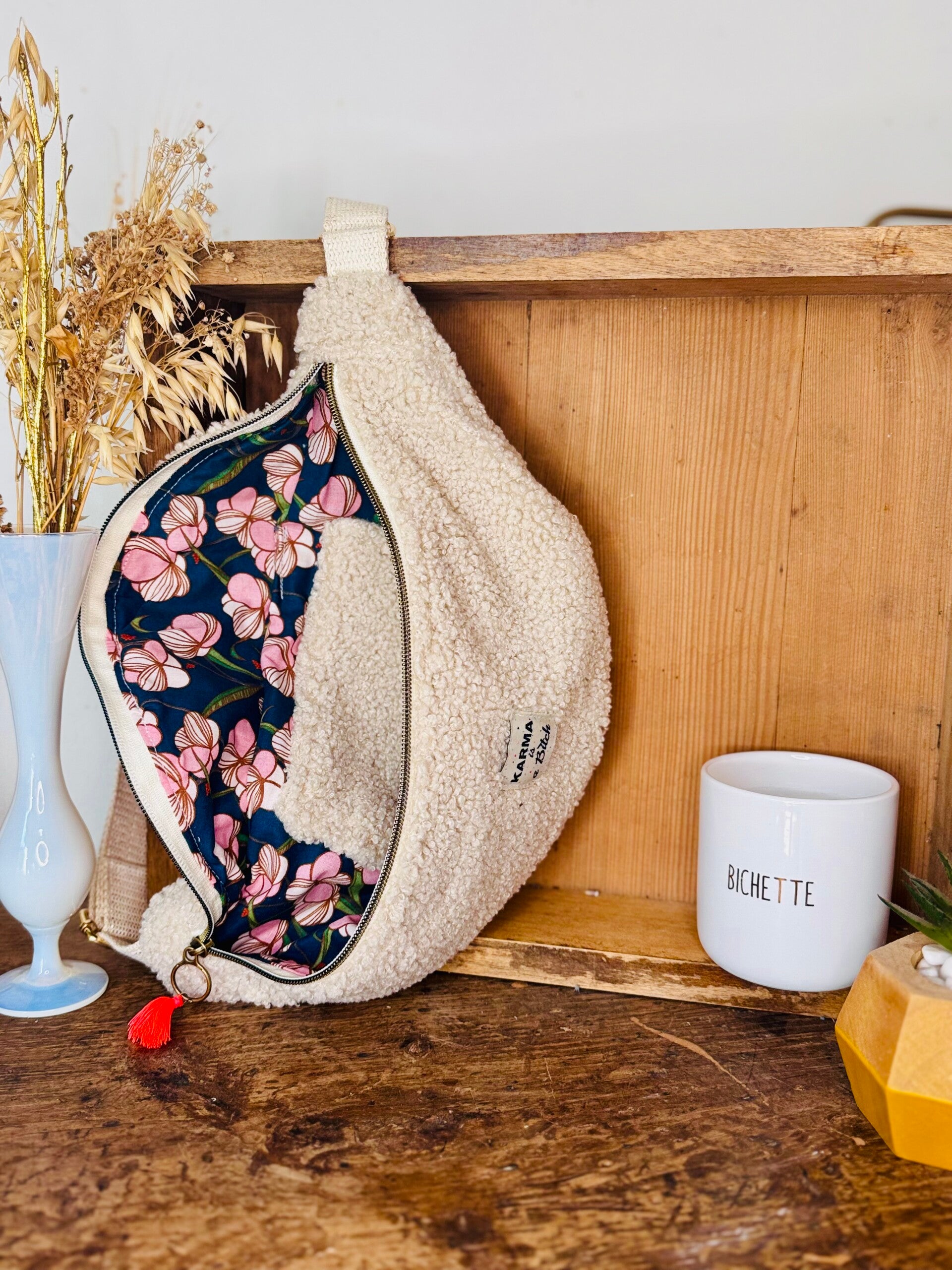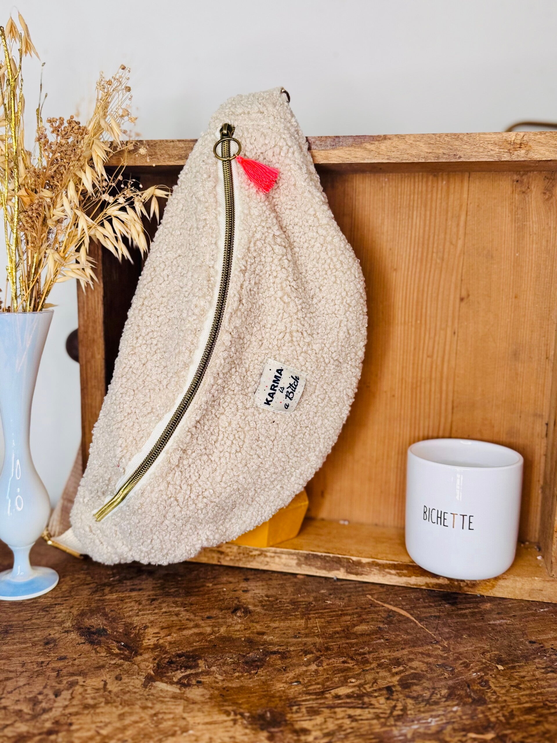 Grand sac banane fait main en moumoute bleige avec son étiquette "Karma is a Bitch"
