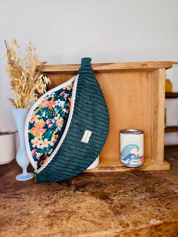 Grand sac banane fait main en velours côtelé large vert sapin avec son étiquette "Petite Bichette"