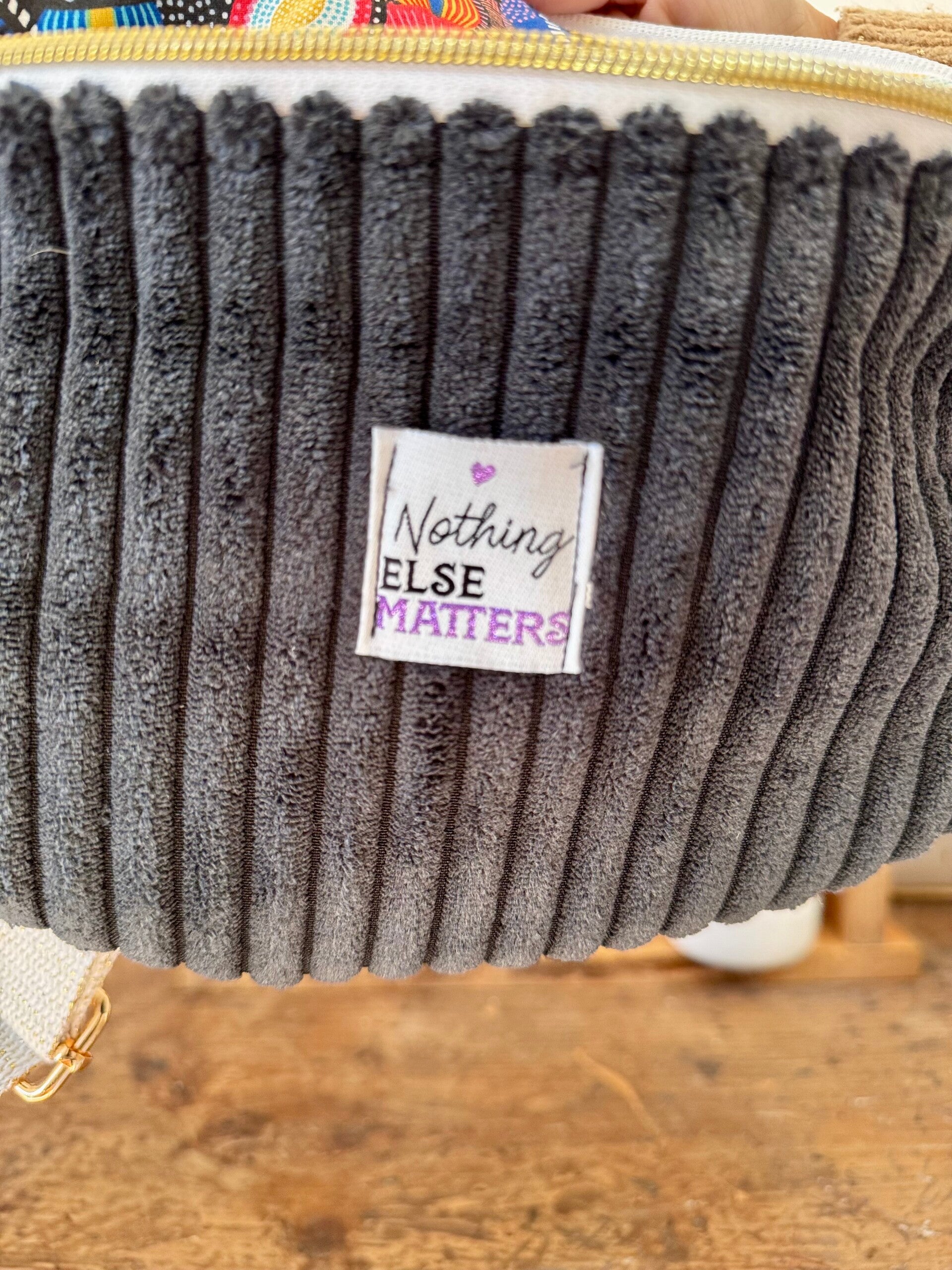 Grand sac banane fait main en velours côtelé large noir avec son étiquette "Nothing Else Matters"