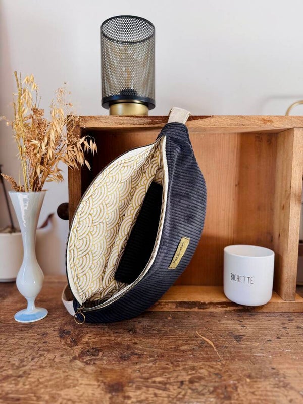 Grand sac banane fait main en velours côtelé fin noir avec son étiquette "P'tit Bouchon"